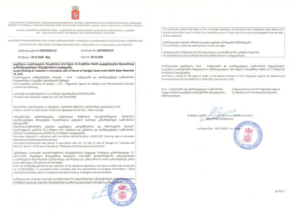 Long before the GDP certification became mandatory, JSC “Medinserv” already met GDP requirements, also passing the audits conducted on the regular basis by its European and American partners – suppliers.