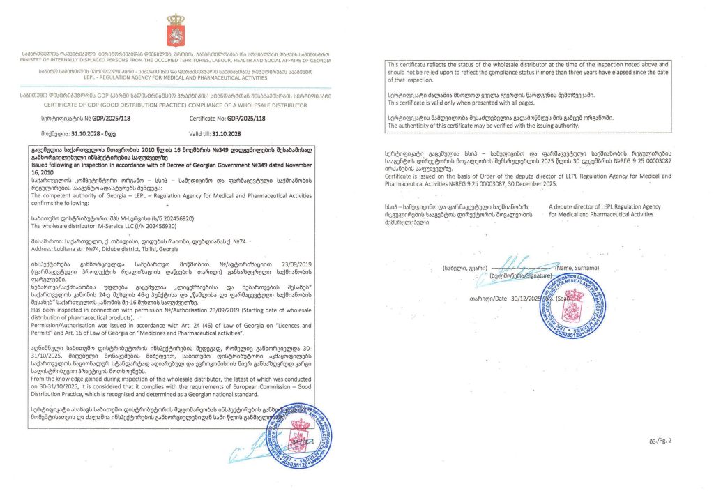 Сompliance with GDP standards of the premises and equipment, warehouse and logistics operations, as well as the qualifications and knowledge of the employees, have been ascertained by audits conducted by European and American partner companies